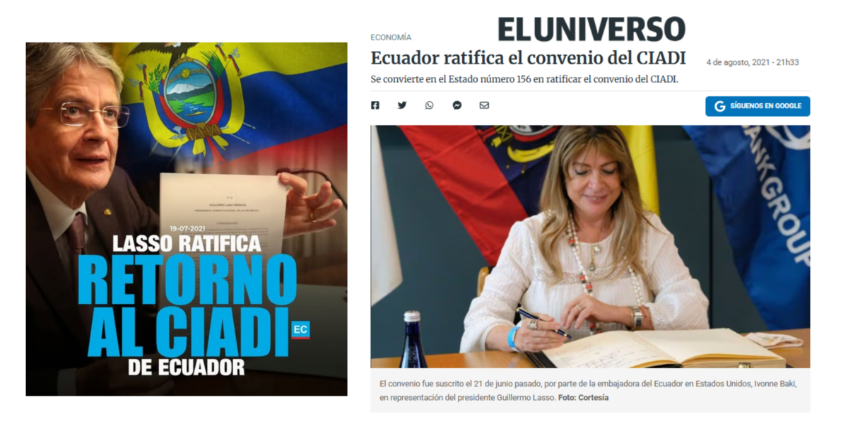 Moreno promovió la firma de 16 nuevos tratados de protección a inversiones para dar “seguridad jurídica” a inversionistas. Por su parte, Lasso reinsertó a Ecuador en el Centro Internacional de Arreglo de Diferencias Relativas a Inversiones (CIADI) en 2021 con el respaldo de la Corte Constitucional, que determinó que no hacía falta la ratificación legislativa. Con el Decreto 165, Lasso formalizó el instrumento ante el Banco Mundial bajo el argumento de atraer la inversión extranjera directa.