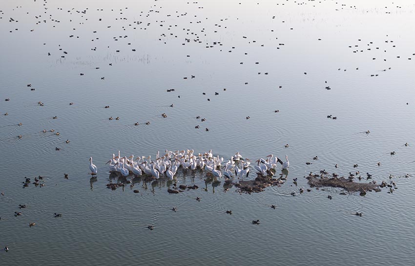 50 pelícanos blancos americanos en el lago de Texcoco. . Foto: Duilio Rodríguez