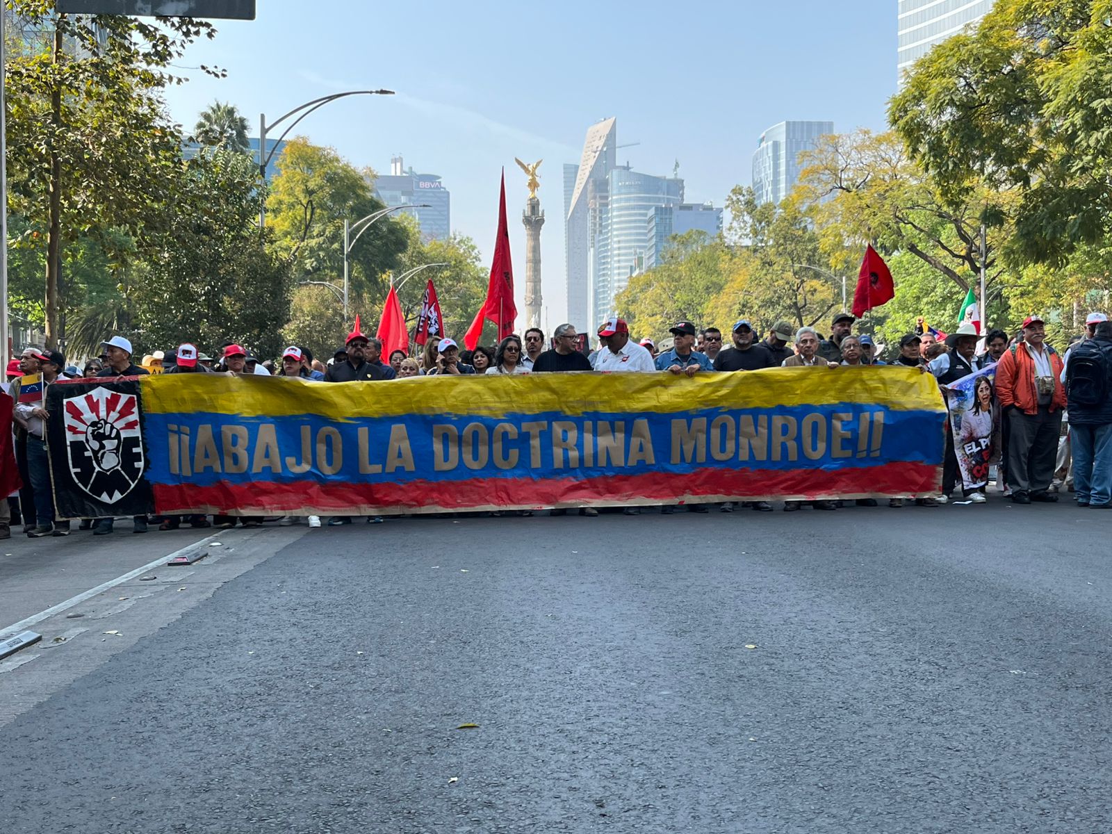 CIUDAD DE MÉXICO. – La crónica comienza con un hilo de humo en el asfalto y el sonido de miles de pies avanzando por el Paseo de la Reforma. Son poco más de las diez de la mañana. Bajo la sombra del Ángel de la Independencia, un hombre de barba canosa ajusta una manta sobre sus hombros. En ella, pintada a mano, se lee una sentencia histórica que hoy resuena con urgencia renovada: “Fuera yanquis de América Latina”. A su lado, una mujer joven sostiene un cartel con el rostro de Nicolás Maduro y la fecha del ataque: 3 de enero de 2026.