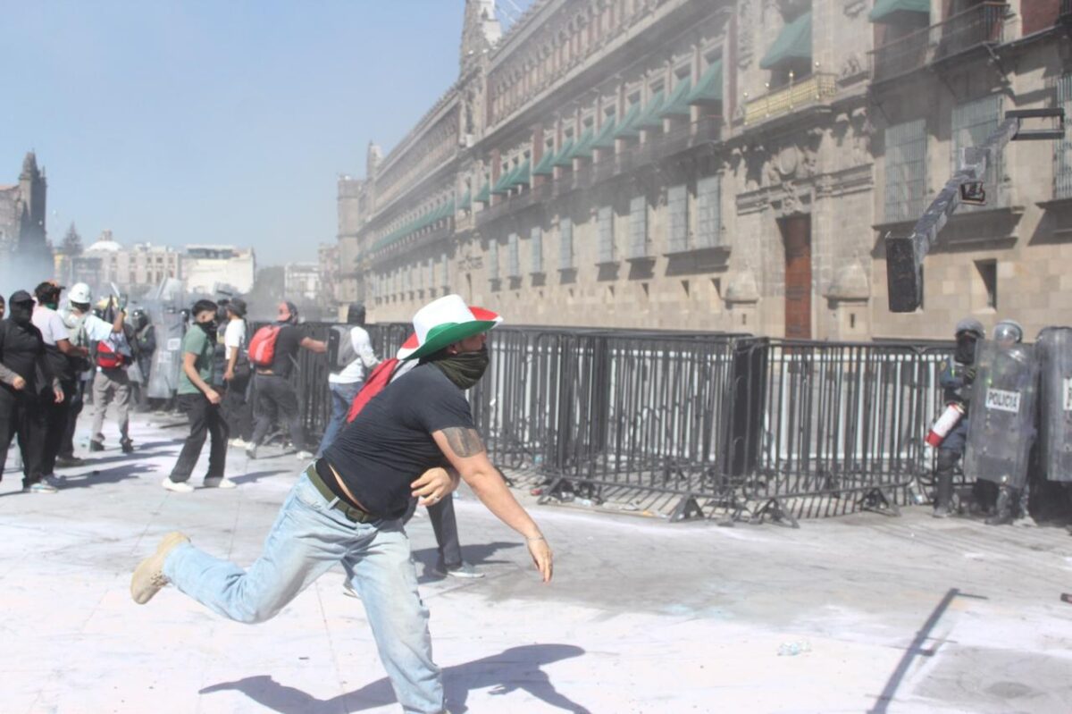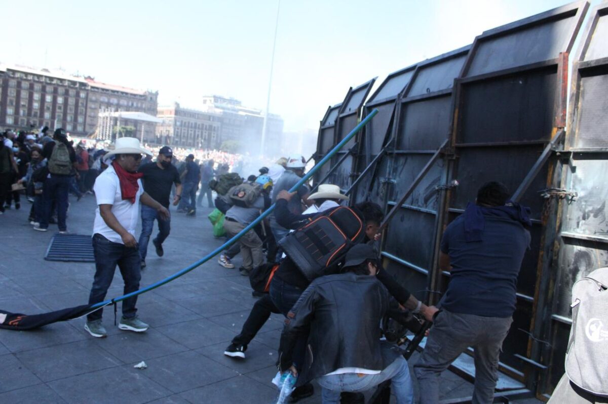 Cuando las personas -17 mil según cálculos oficiales- que participaron en la marcha llegaron al Zócalo, comenzaron las acciones contra Palacio Nacional. El grupo de jóvenes, ya preparado, ató cuerdas a las vallas y tiró de ellas hasta derribarlas. A partir de ese momento comenzó el enfrentamiento con la policía, que en un primer momento intentó hacer un escudo humano de protección del inmueble.